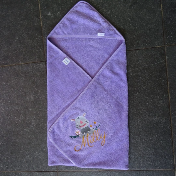 Voeg een persoonlijk tintje toe aan je kraam of verjaardagscadeau door op de muts of zijflappen van de badcape een naam, geboortedatum of andere tekst te laten borduren.
